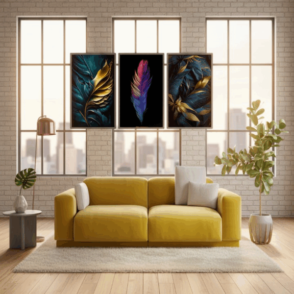 Description3-Piece Feather Design Wall Art Frames – Modern Decorative Wall Hanging Set, 8×11 Inches Each with Double Tape for Easy InstallationBring elegance and style to your living space with this 3-piece feather design wall art set. Featuring vibrant and artistic feather patterns, these frames add a modern and luxurious touch to any room. Each frame measures 8×11 inches, making them ideal for bedrooms, living rooms, offices, or hallways. Designed for hassle-free installation, the set includes double tape, so you can easily paste them on your wall without drilling or nails. With premium quality prints and durable frames, this decorative wall hanging set is a perfect way to upgrade your home décor effortlessly.Key Features:Set of 3 wall art frames with feather designFrame size: 8×11 inches eachIncludes double tape for easy installation (no drilling required)Stylish and modern look, perfect for any room décorDurable frame and high-quality print for long-lasting useIdeal for living rooms, bedrooms, offices, or as a gift