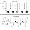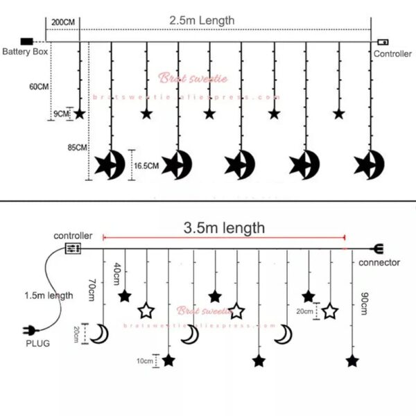 The wire length is 2m(6.6ft), the large star and moon diameter 16cm(6.29inch), which each string droops 1.1m(3.6ft);Small star diameter 9cm(3.54inch), which each string droops 60cm(2ft). Super long power line length 2m(6.6ft).