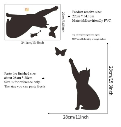 • Adorable kitten and butterfly wall sticker for home decor.