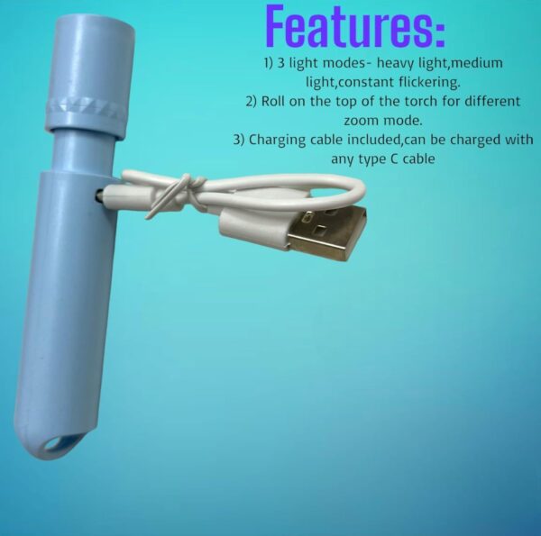 With three lighting modes — High, Low, and Strobe — it provides the flexibility you need for camping, hiking, night walks, or emergency situations. Powered by a 1400mAh rechargeable lithium-ion battery, the torch offers extended runtime and comes with a USB charging cable for convenient recharging.