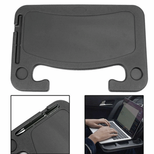 Multi-function steering wheel tray has a deep cup holder area on one side, which has a deep flat surface for enjoying food on the steering wheel, and a flat surface on the other side for placing your laptop and pen holder.