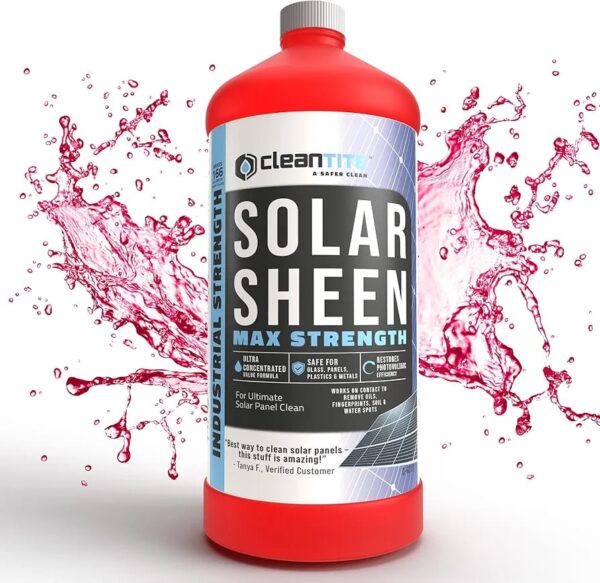 Solar Sheen is a specially formulated cleaning solution designed to restore clarity and maximize the energy output of your solar panels. Over time, panels accumulate layers of dust, grime, and bird droppings that can significantly reduce efficiency. Solar Sheen penetrates and lifts these contaminants without damaging the surface or leaving behind streaks. Its non-abrasive, residue-free formula ensures your panels stay clean and perform at their best with every use.